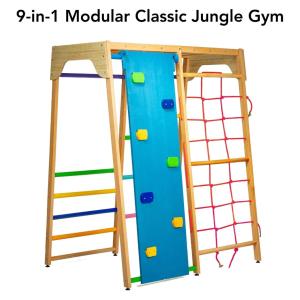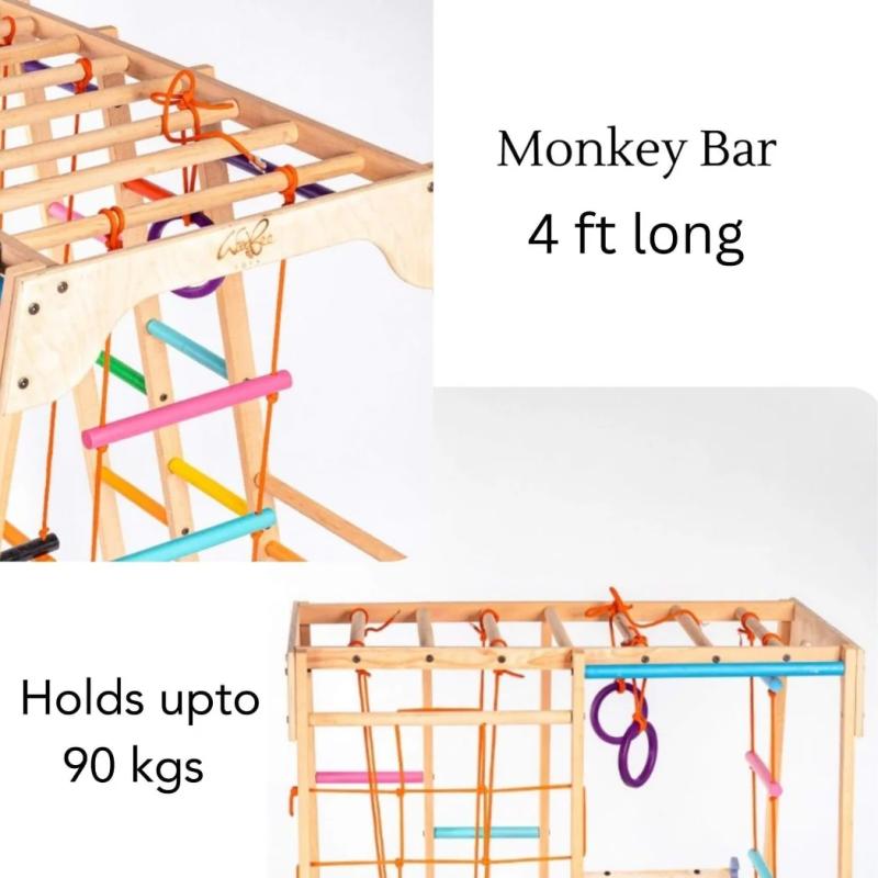 WoodBee’s 9-in-1 modular Jungle Gym is a one stop for aiding in gross motor skills development in toddlers. Create a complete playground inside your home. A wooden jungle gym can provide various benefits for a baby's physical and cognitive development. Here are some potential advantages: