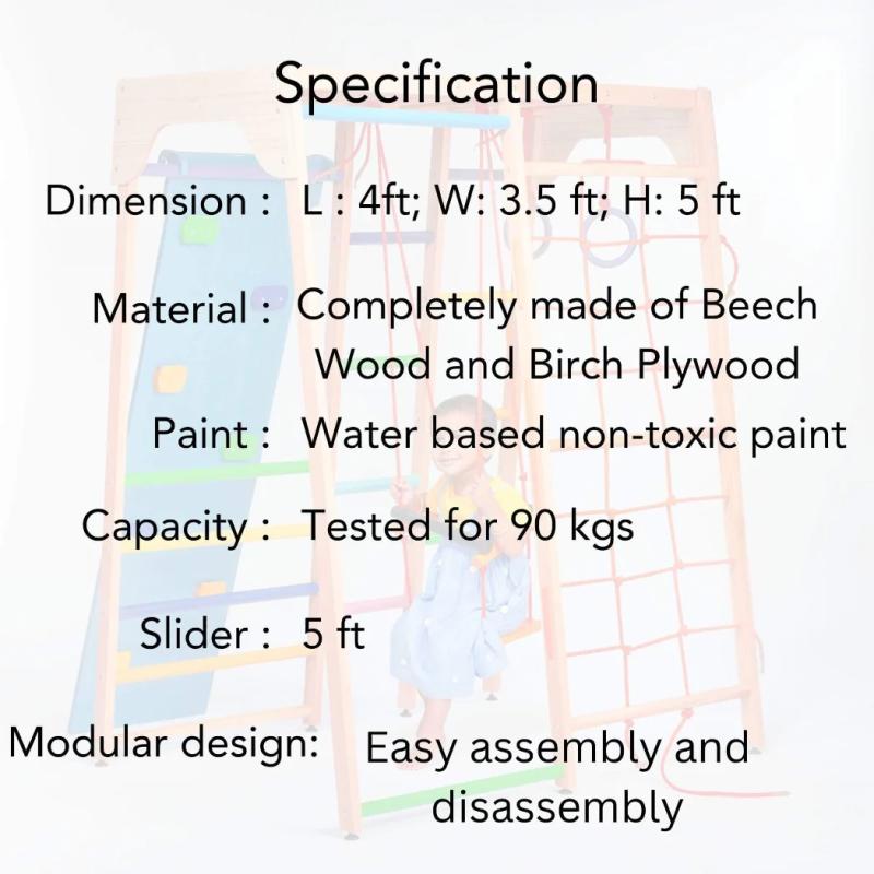 Strongest and Sturdiest: WoodBee’s 9-in-1 Jungle gym is completely made of Beech wood and Birch plywood. Beech wood is a hard wood and thus have more weight bearing capacity. The sturdiness of wood, compactness and durability of the overall structure makes it a must have and can be used by more than one kid in a combined weight of around 80 to 100 kgs.