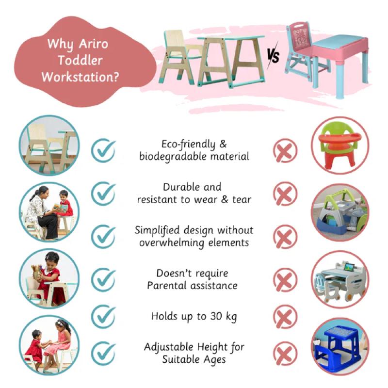 Having their own area for work makes toddlers feel a sense of belonging with the space as well as ownership for it. When toddlers have their own work chair and table. It encourages them to take care of it. We can set up practical life activities for wiping and cleaning the table and chair, fostering care for their environment in the toddler.