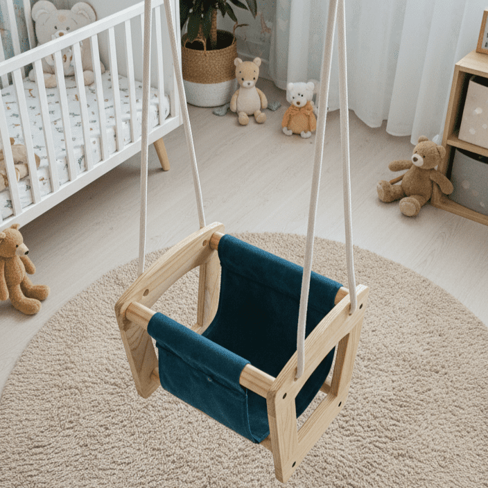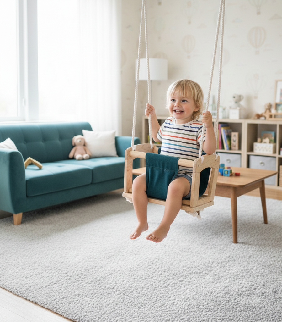 The Happy Bounce Swing is a cozy and secure hanging chair designed to create a relaxing and playful space for your child. Made with a sturdy wooden frame, strong suspension ropes, and smooth child-safe edges, it offers reliable support and comfort.